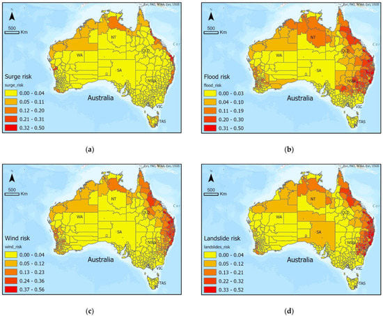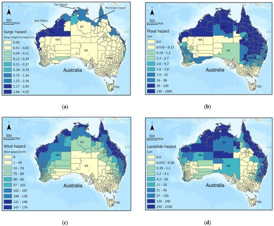 Storm surge data were acquired from GAR Atlas’ risk and data platform, which mapped TC storm surge height as point data along the Australian coastline roughly every 1 km. TC wind data were sourced from [24] as high-resolution raster data over Australia and its northern waters. Flood data were sourced from [25] as high-resolution raster data representing riverine flooding only. Thus, non-null values tended to only appear near riverine systems and catchments. Similarly, landslide data from [26] were in the raster format with mostly null values apart from specific locations with significant landslide hazard.