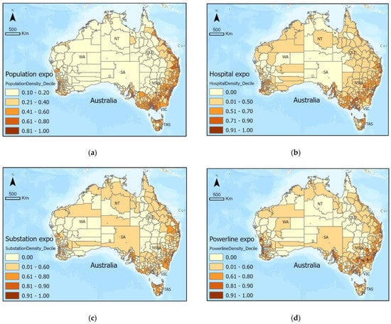 Exposure indicators of population, hospitals, substations, and power lines were chosen to represent physical assets of human life, as well as systems and infrastructure that are important in the case of emergency disaster events (hospitals, power). Failure to maintain the function of lifeline infrastructures such as hospitals and power can lead to exacerbated negative impacts [27]. These chosen indicators aim to spatially describe which LGA regions have more exposed assets relative to the rest of the country. Electrical substations provide power as critical infrastructure and are strategically placed to meet demand. Similar reasoning influenced the choice of public hospitals and powerlines.
