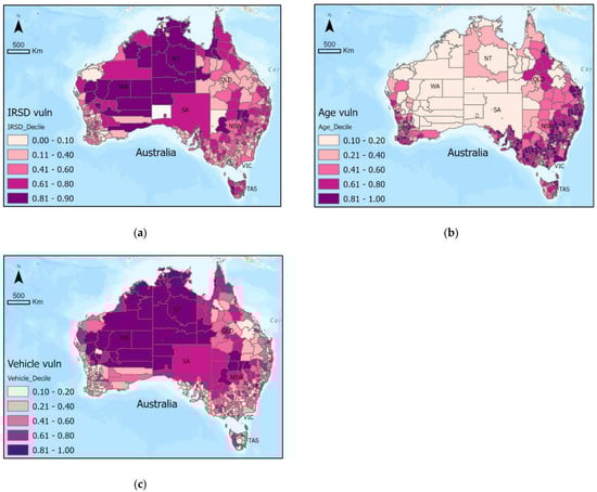 Vulnerability indicator maps of IRSD (a), vulnerable age groups (b), and no-vehicle homes (c).