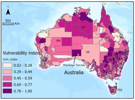 Overall, the vulnerability index shows higher vulnerability and, thus, predicts higher risk throughout NSW, northern QLD, and northern NT.