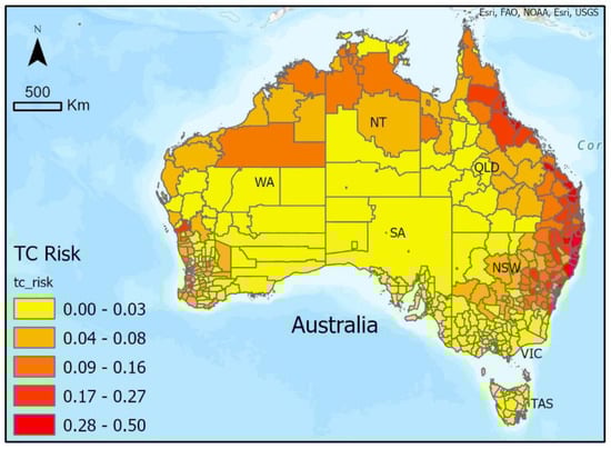 Vulnerability indicators were chosen to represent those regions most susceptible to high impact from a TC event occurring in the vicinity. Measures of socioeconomic status are commonly used to describe vulnerability to natural hazard events [29,30] and the Index of Relative Socioeconomic Disadvantage (IRSD) has been used in earlier studies for the Australian region [31]. It summarises variables about the social and economic conditions of households. The more disadvantaged a region is socioeconomically, the more likely it will be more impacted by TCs, due to factors such as lower income, having families with only one parent, or having a higher percentage of people that have English as a second language. The ‘no-vehicle homes’ indicator was derived by calculating the percentage of homes with no vehicles, and the ‘vulnerable age groups’ indicator was constructed by calculating the percentage of an LGA’s population made up of the <15 and >65 age groups combined. The ‘no-vehicle homes’ indicator is considered relevant to TCs as it provides information on LGAs that are more susceptible to loss of human life in evacuation situations. Although this risk assessment highly values human life and safety, historically within Australia, TCs have caused very few fatalities in recent decades, and an indicator describing the vulnerability of infrastructure would be preferred. An alternative to the ‘no-vehicle homes’ vulnerability indicator could be the proportion of houses that are not constructed to modern wind loading standards. While this potentially useful indicator was not included in this study due to limited data availability, this could be a topic for future work.