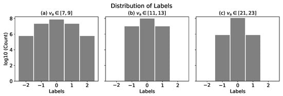 Three different combined methods are trained. One is performed by combining and , which is named . The second option, which is named , is a training set with set to a random variable that has a uniform distribution between 7 and . When is higher, the training data have less labels and more labels. The higher becomes, the more skewed the distribution becomes, as shown in Figure 1. During the training process, the population of a label dictates the number of adjustments that are made to identify that particular label. Logically, the labels with the highest counts would be fitted the best. However, the goal is to achieve similar performance among all labels. One way to overcome this imbalance is by using a so-called class weight, which is inversely proportional to the population ratio of the labels, effectively undoing the imbalanced adjustments caused by the population distribution.