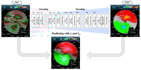 With the synthesized , post-processing will be performed with the trained CNN model. As shown in Figure 2, passes through the model with the optimized parameters. It is used to produce an output with the predicted label (aliased count) . As we explained earlier, the model has two main processes: encoding and decoding. In the encoding process, the convolutional and pooling layers are stacked to extract the features by decreasing the range and the azimuth size. In the decoding process, the output label is generated by de-convolution and up-conversion to recover the same input data size. The softmax classifier and a one-hot coding method are applied to generate the . Dealiased velocity is generated by combining the , , and the Nyquist velocity and it is shown in the following: