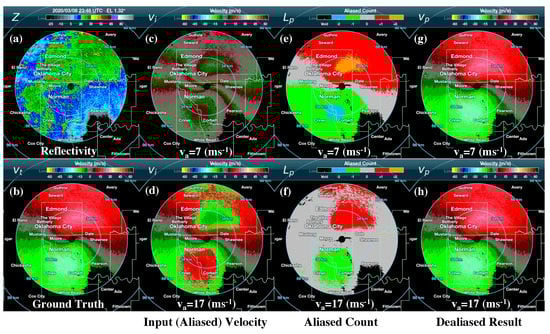 Figure 3 illustrates the velocity dealiasing process with two synthetic velocity fields with a different . This is an example of mostly filled precipitation, with a homogeneous wind field and a broad continuous precipitation field. Figure 3a shows the radar reflectivity Z, and Figure 3b is the ground truth data () from the S-band radar velocity field. The second column is the input (aliased) velocity (), which is manually aliased by using Equation (2). The third column is the predicted aliased label (), and the last column is the dealiased velocity using Equation (9). In Figure 3c, is aliased by , where Figure 3e includes , , and . Figure 3d is the aliased by , and is not included as shown in Figure 3f. Regardless of different , dealiased velocity is shown as similar to ground truth for both (Figure 3g,h), illustrating the efficacy of using a CNN model to label the velocity aliasing count correctly.