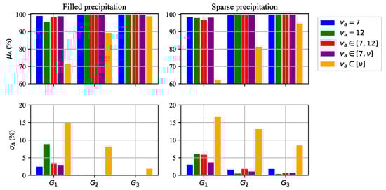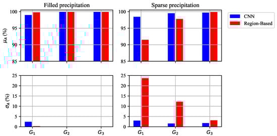 For the sparsely filled precipitation, which has a higher complexity than the mostly filled precipitation scans, the CNN method achieves higher , and with much lower , compared to the region-based method. For both methods, the overall accuracy is higher than the group specific accuracy () since is derived with more elements in as the set includes groups and .