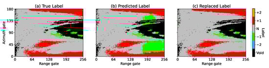 Figure 5 shows an example of an incorrect prediction. From Figure 5, panel (a) shows an image of the true labels, and panel (b) is an image of the predicted labels using the CNN model. Panels (c)–(h) are the softmax classifier outputs, i.e., it normalizes a vector to the [0, 1] range for each label, and the sum of each softmax output is 1. Therefore, it shares many characteristics of a probability distribution of a random variable. There are significant overlaps between labels ‘−1’ and ‘0’. Some ‘0’ labels are predicted as ‘−1’ labels. In these instances, the otherwise correct label ‘0’ has the second highest probability. In order to obtain more insight into the incorrect prediction, a similar scan, which is at around the same time but from a different elevation angle is compared. In Figure 6, the predicted label is mostly correct, but it somewhat overlaps between the label ‘−1’ and ‘0’. It shows a low probability area, which is lighter than adjacent pixels, in the correct label ‘0’, and the second highest probability, which is darker than adjacent pixels, is shown in the incorrect label ‘−1’.
