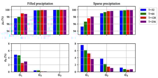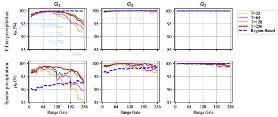 Comparisons of the performance of the trained CNN with different template sizes (T), i.e., 32 (blue), 64 (green), 128 (red), and 256 (purple) range gates on mostly filled precipitation (left), and sparsely filled precipitation (right). It is tested with three different group, i.e., , , and .
