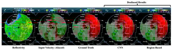 The performance difference can be attributed to the discontinuity of the storms, which the region-based greatly suffers as the first-guess field cannot be produced correctly. There is an option to utilize external wind measurements to aid this process but not practiced in this work, for the sake of fairness for comparisons. The CNN model, which has a receptive field of the entire scan, is capable of processing the entire scan in one shot. Through the large collection of velocity fields in the training dataset, one can surmise that the CNN model has learned what a proper velocity field and the corresponding aliasing label should look like and, thus, is capable of producing the correct labels despite the discontinuity of the storms. This level of data comprehension and processing is what a human would do during a hand dealiasing process.