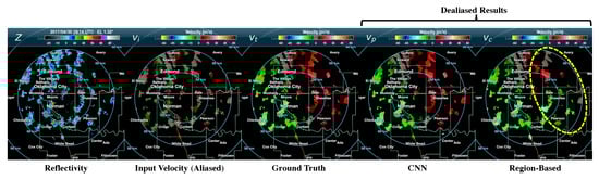 Similar to Figure 11, this figure shows an example PPI scan with isolated storms observed at . The data are synthesized using a 1.32°-EL scan from the KTLX on 30 April 2017 19:14 UTC. The CNN method successfully dealiased the scan as it processed the entire scan all at once. The region-based method, however, failed at a number of isolated storms, which are indicated in the yellow circle. In this example, CNN method predicts the 99.5% on , 99.4% on , and 100% on , while the region-based method predicts 77.9%, 67.8%, and 84.4% on , , and for each.