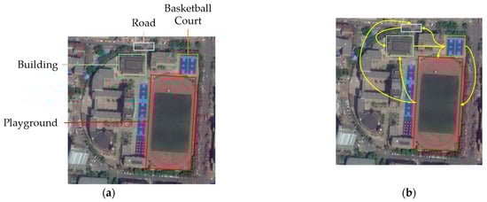 (a) Local visual feature and (b) long-term contextual feature are selected from the “School” category. The long-range contextual information is not considered by CNNs, which specialize at extracting local characteristics. (a,b) show many distinct land covers, such as “Playground,” “Building,” “Road,” and “Basketball Court.” If the model only concentrates on those local regions, the “School” scene could be mistaken for other scenes with comparable ground objects. Thus, to accurately classify this scene as “School,” local regions and their long-term contextual dependencies, as indicated by the yellow arrows, should be taken into account by the expected model.