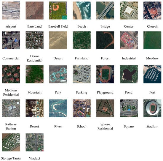 - AID is an aerial scene classification dataset released by Wuhan University, consisting of a total of 10,000 images. It contains 30 categories of scene images, of which each category has approximately 220–420 images. Furthermore, the pixel size of each image is approximately , with spatial resolution varying from approximately 0.5 m to 8 m. Figure 4 presents a sample of each class in this dataset. Figure 4 displays several samples from this dataset.