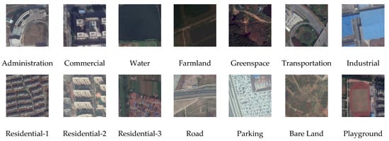 Figure 4. Examples of the AID dataset. - WH-MAVS is a multi-task and multi-temporal dataset with dual phase, 2014 and 2016. It is based on Google Earth’s large-scale mosaic RGB images with the spatial size of pixels. The dataset spans 2608 km2 of the major city of Wuhan, Hubei Province, China. It comprises 23,567 labeled patch pairings with one-to-one geographical correlation between 2014 and 2016. Each patch pairing is pixels in size and has a spatial resolution of 1.2 m. The WH-MAVS comprises 14 categories, as follows: commercial, water, administration, agricultural, transportation, industrial, green space, residential 1, residential 2, residential 3, road, bare land, parking lot, and playground. The total number of samples in each category ranged from 126 to 5850, showing that the dataset has a substantial sample unbalanced issue. For RSSC, the data from the 2016 time phase are used to conduct the experiment. Figure 5 displays several samples from this dataset.
