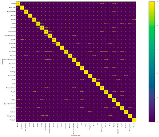 We repeat the experiments three times to acquire reliable experimental results by randomly picking the training/testing samples. Subsequently, more convincing average results and standard deviations are provided. The training–test sample ratio of AID and WH-MAVS is divided into 5–95%, 10–90%, 20–80%, and 50–50%. To assess the classification performance, two frequently used assessment metrics, namely, overall accuracy (OA) and confusion matrix (CM), are selected. The OA is computed by dividing the overall quantity of correctly categorized images by the overall quantity of test images, allowing the RSSC model’s performance to be accurately evaluated. CM is a tabular summary of the number of accurate and inaccurate predictions made by the classifier, and it is also the most basic and intuitive metric of the RSSC model’s accuracy.