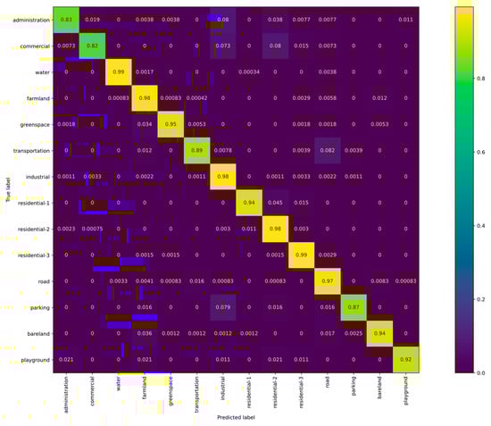 Furthermore, Figure 7 displays the CM of our proposed method on the WH-MAVS dataset utilizing 50% training samples. Ten of the 14 categories were classified with over 90% accuracy. This result proves the relatively good performance of the proposed HCFPN. Nevertheless, HCFPN performs poorly in some categories, with high inter-class similarity, such as “commercial” and “administration.”.
