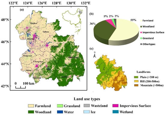 (a) The land-use type and (b) distribution and (c) landforms of the study area.