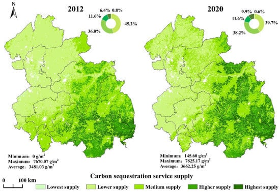 - The supply of carbon sequestration services showed a distribution pattern of “high in the southeast with high elevation and low in the northwest with low elevation”. From 2012 to 2020, the supply of carbon sequestration services increased in eastern mountainous areas and decreased in the regions with lower elevation.