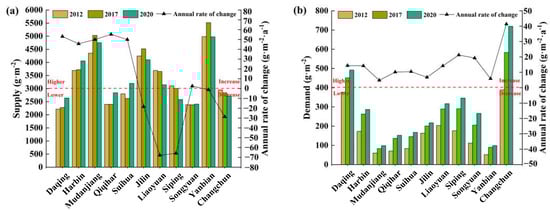 Supply and demand were characterized by significant spatial heterogeneity among the different cities (Figure 6a). In most cities, the supply was much higher than the demand. The average annual supply ranged from 2550 g·C/m2 in higher supply cities to 550 g·C/m2 in lower supply cities, whereas the average annual demand in higher and lower demand cities was approximately 555 g·C/m2 and 80 g·C/m2, respectively. From 2012 to 2020, the supply either increased, decreased, or stabilized in each city, whereas the demand increased in all cities, and the average annual rate of demand increase was approximately 14.8 g·C/m2·a−1 (Figure 6b).