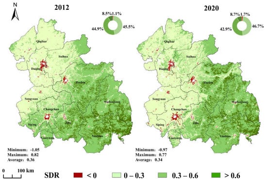 The SDR of carbon sequestration services can quantitatively describe the balance between regional supply and demand and reveal the distribution of carbon surplus and deficit []. The calculation formula is as follows: