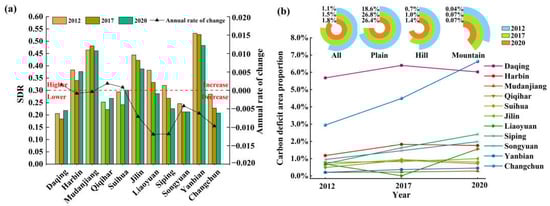 The SDR of most cities decreased, indicating an increasing imbalance between the supply and demand of carbon sequestration services in the HCUA. The carbon deficit areas in the HCUA tended to increase, from 1.1% in 2012 to 1.8% in 2020, and the carbon deficit areas of most cities increased annually, with the largest increase reaching 4.0% in Changchun from 2012 to 2020, particularly for cities in the western plains. Changchun is an important industrial base in northeast China, and has experienced rapid economic development in recent years. However, the type of economic development was industrialized development, which mainly relied on the traditional automotive industry, equipment manufacturing industry, and other industries that require large amounts of energy consumption, but the industrial structure has not been adjusted in time, leading to excessive emissions of carbon dioxide and a significant expansion of carbon deficit areas. Moreover, the proportion of regions with carbon deficit increased more in plains than in hills and mountains (Figure 8b).