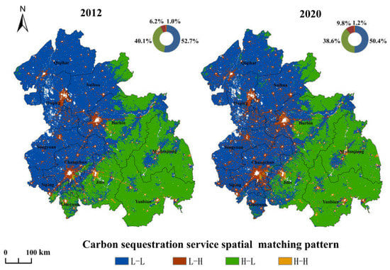 - The spatial matching pattern of the carbon sequestration services was dominated by the L–L pattern, occurring mainly in the northwest and southeast regions. The L–H pattern showed significant spatial mismatching between supply and demand in the HCUA. The proportion of regions with the L–H pattern increased obviously from 2012 to 2020, and the carbon deficit tended to be more obvious. The results of our study provide important guidelines for the implementation of low-carbon development strategies under China’s rapid urbanization.