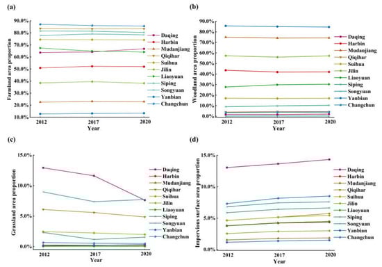 (a) The temporal variations of farmlands, (b) woodlands, (c) grasslands, and (d) impervious surfaces in each city from 2012 to 2020.