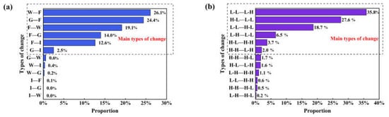 The main types of land-use change in the HCUA were the conversion of woodland, grassland, and farmland into each other. The proportion of land conversion to farmland (50.5%) was higher than the conversion from farmland (33.1%). The conversion types also included the conversion of farmland and grassland to impervious surfaces, with a proportion of 15.1% (Figure 11a). The spatial matching pattern of supply and demand for carbon sequestration services mainly showed negative changes, such as the L–L pattern to the L–H pattern and the H–L pattern to the L–L pattern, with a proportion of 63.4%. Positive changes such as the change in the L–L pattern to the H–L pattern and the L–H pattern to the L–L pattern accounted for 25.2% (Figure 11b). The negative change in the spatial pattern of the region mainly showed a decrease in the supply level and an increase in the demand level. The decrease in the supply level was mainly attributed to two reasons: first, the northeast region of China is the main grain production base. To guarantee China’s food security and protect the red line of arable land, since 2008, China suspended a large-scale project for returning arable land to forest, causing the conversion of other land-use types to farmlands. Because the carbon sequestration capacity of farmlands is not as good as woodlands, this conversion negatively affects vegetation carbon sequestration and the ecological environment. Second, some studies have shown that a CNY 4 trillion investment and large real estate development had a significant negative impact on ecosystem conservation []. Although cities were the areas where CO2 emissions were most concentrated, urban impervious surfaces continuously encroached on urban farmlands and forests, and this reduction in vegetation coverage weakened the ability to fix carbon in these areas. In addition, similar results suggested that the significant degradation of ecosystem functioning was occurring in areas with concentrated land development and use []. The increase in demand levels was mainly due to increased urbanization, the gradual increase in the consumption of fossil fuels in developed urban areas, and the adoption of the traditional crude economic development model to meet continued economic growth, which caused rapid growth in CO2 emissions. The main reason for the positive change was the increase in the supply level of the spatial pattern of the region. The implementation of the “Wetland Reserve Construction Project” and the “Water into Wetlands Project” in northeast China significantly improved wetland functioning and significantly enhanced vegetation carbon sequestration in wetlands. In addition, in recent years, China has vigorously called for the construction of an ecological civilization, and the construction of urban ecosystems has been steadily promoted, causing an improvement in the urban ecological network.