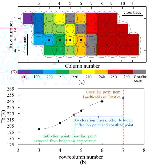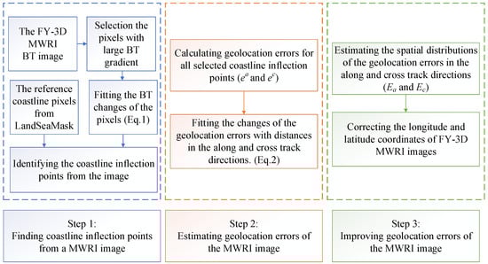 - Li, W.; Zhao, X.; Peng, J.; Luo, Z.; Shen, L.; Han, H.; Zhang, P.; Yang, L. A new geolocation error estimation method in MWRI data aboard FY3 series satellites. IEEE Geosci. Remote. Sens. Lett. 2019, 17, 197–201. [Google Scholar] [CrossRef]