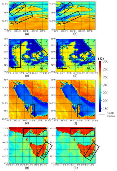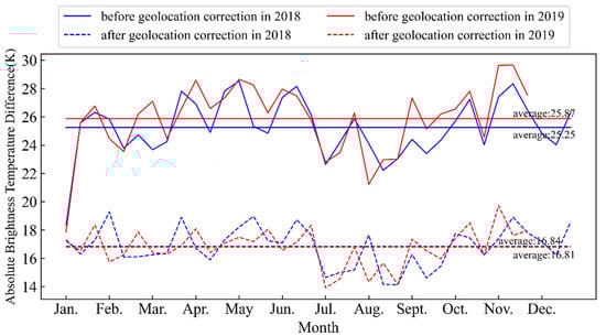 3.2. Comparisons of the Brightness Temperature Differences before and after Geolocation Correction