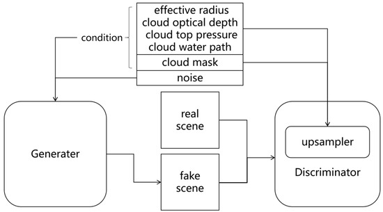 The recent development of deep-learning technologies provides a feasible way to overcome these above problems. A GAN (generative adversarial network) model was proposed by Goodfellow et al. in 2014 [19], which uses two neural networks for adversarial training. GAN and its derivative models are commonly used to generate samples for data enhancement and data preprocessing. The generative model represented by the conditional adversarial neural network CGAN is suitable for the data retrieval purpose. CGAN is a branch of GAN, which can achieve the combination of input conditions and noise based on the input conditions to generate results. Leinonen et al. (2019) [20], hereafter L19, applied the CGAN model to retrieve the cloud vertical structure based on the MODIS data and confirmed the feasibility. The model was trained using the matched CloudSat vertical radar reflectivity and MODIS cloud products including Re, COT, CWP, Cloud Top Pressure (CTP), and Cloud mask.