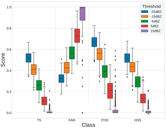 As can be seen in Figure 4, for the −25 dBZ threshold (which essentially characterizes the overall cloud body), the mean TS score is greater than 0.5, with an overall performance of 0.35–0.67, indicating that more than half of the overall extent of the “cloud” was predicted. The mean FAR value is around 0.3 and the mean POD score is around 0.65. Thus, the overall predicted cloud area size is close to the actual one, but with a deviation of around 30% in position. The HSS mean value is greater than 0.5, indicating that after eliminating the correct predictions due to purely random chance, more than half of the predictions are measured correctly.