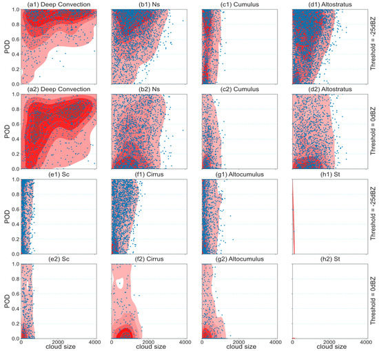 POD vs. size scatterplot of all-sample in the test set for thresholds of −25 dBZ (a1–h1) and 0 (a2–h2). The horizontal coordinate is the cloud size (i.e., the number of pixels covered by each inverse cloud sample region) and the vertical coordinate is the POD score. A point in each subplot indicates the POD result of a retrieved cloud sample. The color shades represent the sample distribution density heat maps.