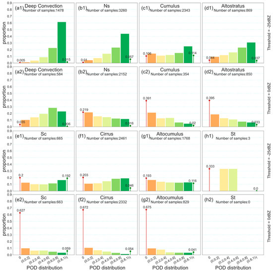 The distribution of POD scores for all test samples with threshold −25 dBZ (a1–h1) and 0 dBZ (a2–h2) for the 8 cloud types. POD values of 0 and 1 are plotted separately to indicate the two special cases of complete missing and complete forecasting, respectively. The percentage of POD falling in each interval is the vertical coordinate. “Number of samples” represents the total number of samples used to plot the statistics.