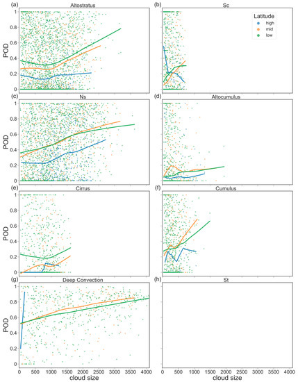 In general, the model performed the best at the lower latitudes. For the Ns clouds, the model performed similarly for the mid- and lower-latitude zones but degraded significantly in the high latitude. The model retrieved the deep convective clouds accurately in both mid and lower latitudes, with a slightly better result in the mid latitude (Figure 7c). The model does not retrieve small-size deep convection properly in the high latitudes but is good with the large ones there. Cirrus in middle and high latitudes and altocumulus in high latitudes are poorly retrieved (Figure 7e). Except for the deep convective clouds and Ns, all other cloud categories have evidently missed some retrievals (Figure 7a,b,d,f,g). The Sc clouds at high latitudes with smaller sizes are better retrieved than those at the middle and low latitudes, but the result may not be representative due to the small sample size (Figure 7b). Again, the samples of St cloud observations are too small to be considered (Figure 7h).