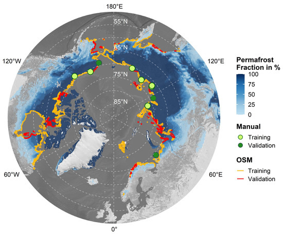 - Obu, J.; Westermann, S.; Barboux, C.; Bartsch, A.; Delaloye, R.; Grosse, G.; Heim, B.; Hugelius, G.; Irrgang, A.; Kääb, A.; et al. ESA Permafrost Climate Change Initiative (Permafrost_cci): Permafrost Extent for the Northern Hemisphere, v3.0’; NERC EDS Centre for Environmental Data Analysis: Norwich, UK, 2021. [CrossRef]