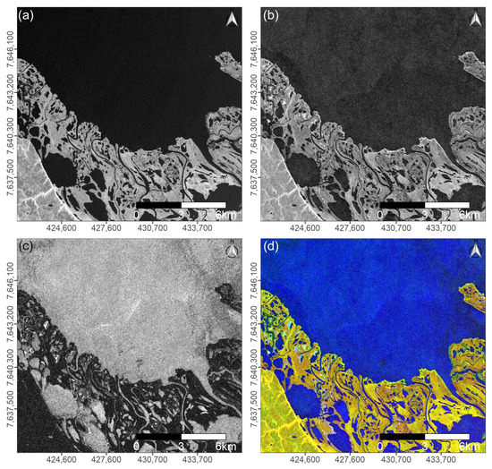- The inverse behavior of median and sd backscatter over sea and terrestrial areas could be successfully exploited for the CVA analysis. However, the quality and applicability of the analysis strongly depend on the number of available scenes, the present coast type, and total sea ice duration during the observed temporal window.