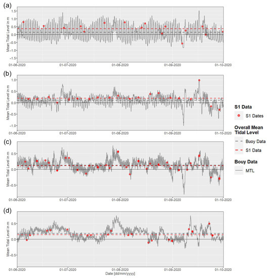 - A good agreement between the average Mean Tidal Level (MTL) from S1 acquisition dates and the actual MTL was observed (±0.02–0.23 m). The higher the number of available S1 scenes, the smaller the gap between the MTL represented by the S1 acquisition dates and the actual average MTL for a given observation period.