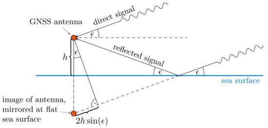 In the idealized scenario depicted in Figure 1, a satellite’s GNSS signal is reflected at the sea surface, and it interferes with the directly received signal at the GNSS antenna. With varying elevation angle of the signal-emitting satellite, the delay between the direct and reflected signal also changes, resulting in constructive or destructive interference at the antenna (with a respective local extremum in the observed SNR), if the subsequent condition is met for a .