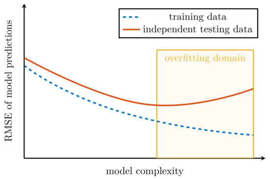 Typical behavior of the root mean square error (RMSE) of model predictions with increasing number of predictors (which amounts to an increase in model complexity); see [18] (pp. 37–38), [19] (pp. 244–252).