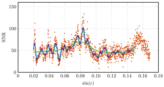 - A Nadaraya–Watson kernel regression [21] with a Gaussian kernel function (4) is performed for the scattered data, as exemplified in Figure 3 and Figure 4. The regression function as expectation value of the SNR conditional on reads as follows: