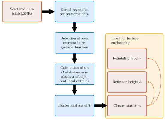 The quantities defined so far refer to a single analysis with associated reflector height estimate and reliability labelling. In the following, we use the additional index to identify and enumerate different analyses, each based on scattered data as depicted in Figure 3 and Figure 4, with an associated kernel regression and clustering analysis. indicates the affiliation of a quantity to a particular analysis: