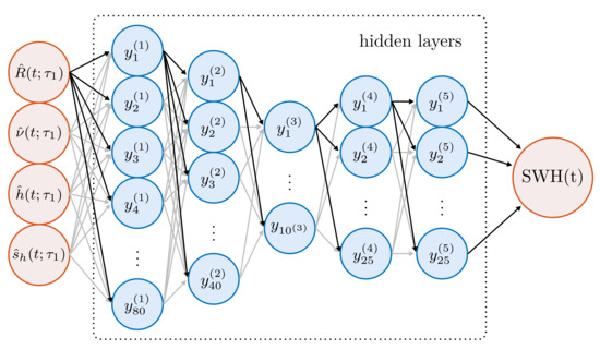 Here, denotes the kth component of the feature vector, and is the value for the SWH as output of the ANN. The parameters , of the ANN are determined in the course of the training, which was performed with the stochastic gradient-based Adam optimizer [27] with exponential decay rates and and an initial learning rate of 0.001. The maximum number of epochs is set to 1000 in order to prevent overfitting. The size of minibatches was set to 200.