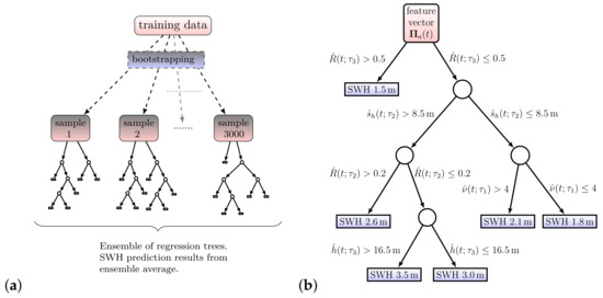 With the bagged (bootstrap aggregated) regression tree [31], the prediction of the SWH results in the average of predictions from an ensemble of regression trees, as illustrated in Figure 7. The ensemble used here consists of 3000 individual trees, each one trained on an individual set of regression cases that are randomly drawn from the training data set with a bootstrap [19] (pp. 172–178). The size of the tree-specific bootstrapped training sets equals that of the original training data set.