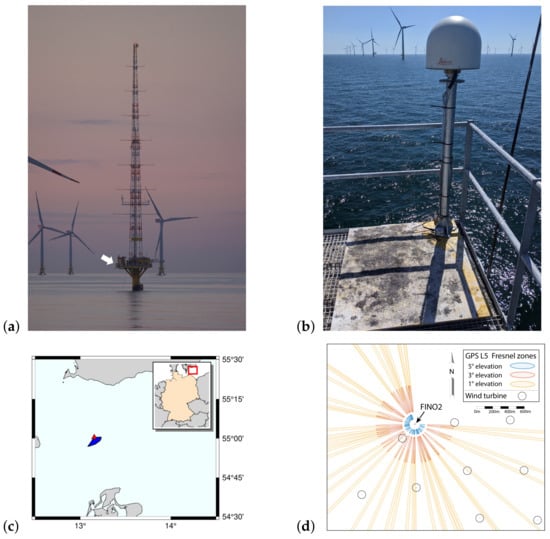 (a) Research station FINO2 in the Baltic Sea. The GNSS antenna is mounted on the platform marked with the white arrow. (b) The GNSS antenna. (c) Map with location of FINO2. The position of FINO2 is highlighted with the red triangle, and the area where wind turbines are located is displayed in blue. (d) Detailed map with location of individual wind turbines and reflection zones for different satellite elevation angles. (Photos: Federal Agency for Cartography and Geodesy, Germany).