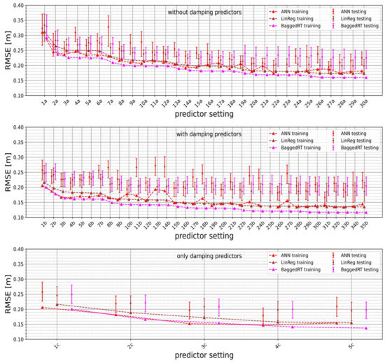 Selected results of the analyses depicted in Figure 9 are stated explicitly in Table 4. The application of predictor setting a with quite a large number of predictors (ANN with predictor setting 27a, linear model with predictor setting 29a) yields a remarkable improvement (concerning testing RMSE) over the usage of a single damping predictor with small averaging time window (predictor setting 1c).