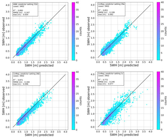 Observed SWH plotted against predicted SWH for the whole testing dataset for four different combinations of model and predictor setting stated in the individual plots. The number of regression cases used and measures for the quality of the estimations are also given.