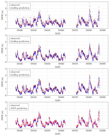 Time series of observed and estimated SWH for testing data available in August and September 2021 for selected estimates with the linear regression or the ANN. Predictor settings used, from top to bottom: 1c, 29a, 26b, 31b. For the intermittent part, the SWH radar sensor measurements were not available. We used the modified Julian date (MJD) as time reference on the horizontal axis.