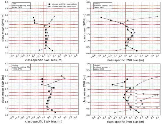 In Figure 11, the four combinations of predictor settings and models used for the estimation of the SWH agree with those used in Figure 10. As is evident from Figure 10 and Figure 11, the testing dataset covers a large range of observed SWH values. Of these values, 157 exceed 2 m. While the estimation with the linear regression for predictor setting 1c exhibits an overshooting of the peaks with observed SWH > 2 m in the time series displayed in Figure 11, and the linear regression for predictor setting 29a mostly shows an undershooting, respectively, the estimation with the ANN based on predictor setting 31b can resolve these peaks quite well. Nevertheless, all estimations shown in Figure 11 still exhibit the weakness that there are small peaks in the estimated SWH around local minima of the observed SWH where the observed values are small. This deficiency similarly shows up in the comprehensive overview of conditional biases for the whole testing data given Figure 12. However, the time series depicted in Figure 11 also demonstrate the improvement over the linear regression with predictor setting 1c, which is obtained by using other predictors from settings a and b or models (i.e., the ANN).