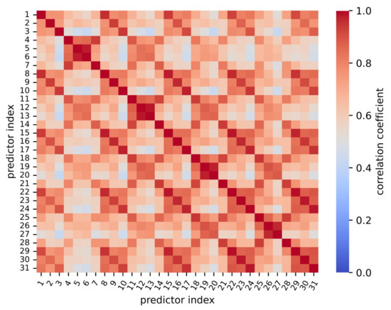 Visualization of the correlation matrix for predictor setting 31b for the testing dataset. The predictor index refers to the position of a predictor variable as occurring in (21) within the concatenated tuple (22). In particular, higher correlations occur for pairs of predictors of the same type, but different time windows used for averaging.