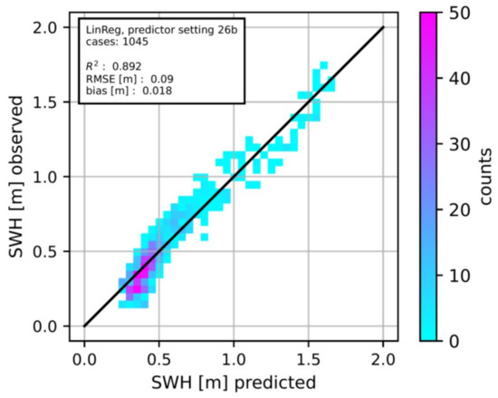 It should be emphasized that the way of selecting predictors for the SWH estimation from the large predictor settings a and b can be enhanced, as the choice of setting c already demonstrates. Redundant predictor data are certainly provided to the models by the successive increase in the number of predictors underlying the analysis depicted in Figure 9. When the models become unnecessarily complex, the improvement in accuracy for independent testing data is rather small (if there is any) with growing complexity, and overfitting can be induced. The calculation of the correlation matrix (Figure 13) showed that there are substantial correlations between certain pairs of predictor time series, leading to unwanted collinearity in respective linear regressions. A dimension reduction with a principal component analysis may be helpful for the generation of a set of uncorrelated predictors without losing valuable predictor information. To a certain extent, the ANN used in the present study already performs an implicit, nonlinear dimension reduction due to its autoencoder-like architecture. Another way of optimizing the choice of predictors for a linear model is a stepwise multilinear regression scheme, as used in model output statistics forecasts [36].