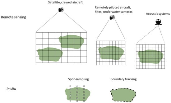 Seagrass is monitored using remote sensing supported by—or alternatively—in situ surveys. Here, we define remote sensing in its broadest sense as any technique that collects data at a distance from a feature without making direct contact (note that, under this definition, some remote sensing techniques require deployment of equipment at or near the focal location), and in situ as techniques that require contact with the feature or data collection in the direct vicinity (e.g., the use of quadrats, standing within a seagrass bed or scuba diving directly above it). One of the main differences between the two approaches with respect to mapping seagrass is that in situ surveys commonly gather information from a set of points within a seagrass bed and interpolate to the whole feature or track the boundary of the feature, while remote sensing techniques are generally aimed at mapping the features in their entirety (Figure 1). There are general advantages and disadvantages to both approaches, summarised in Table 1.